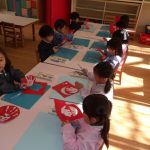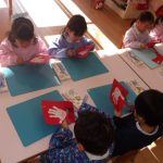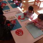 そして、前にとっておいた手形を、はさみで切って、お顔を描いて…
